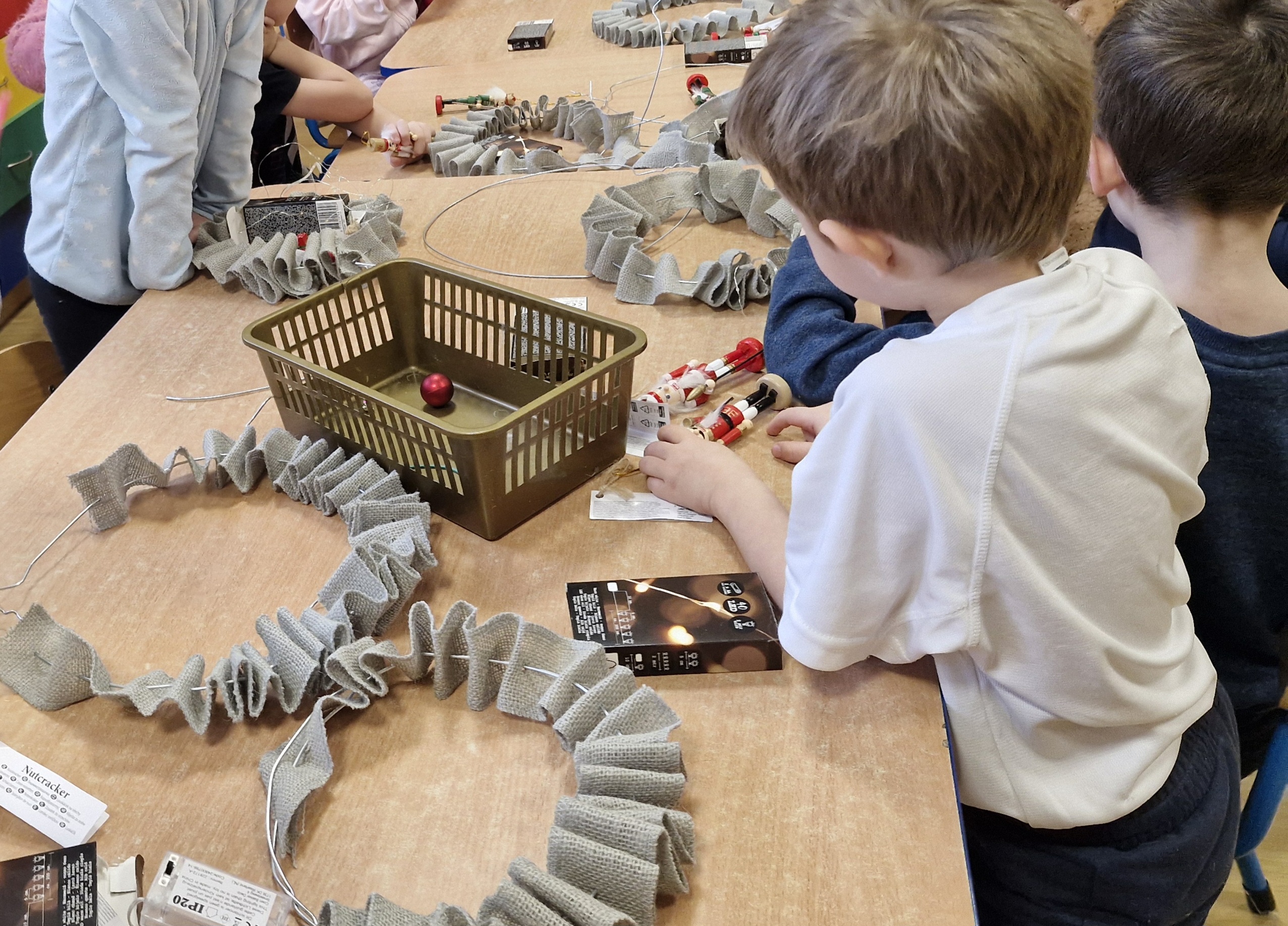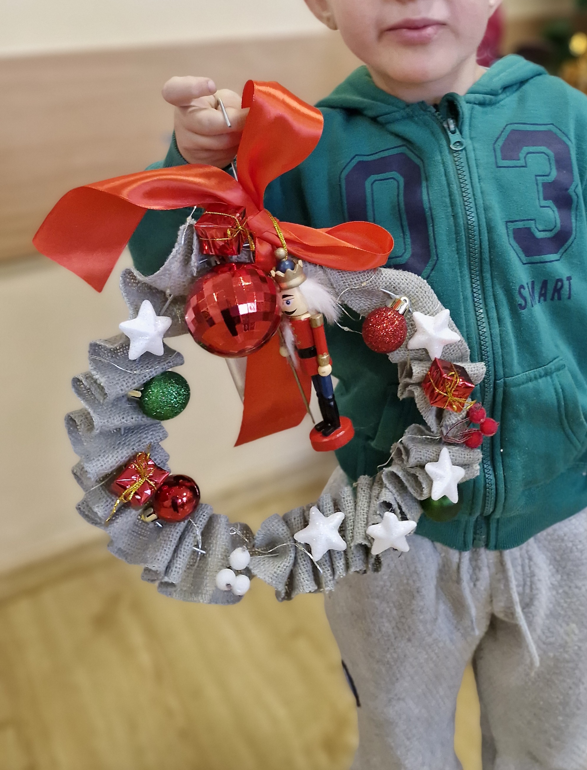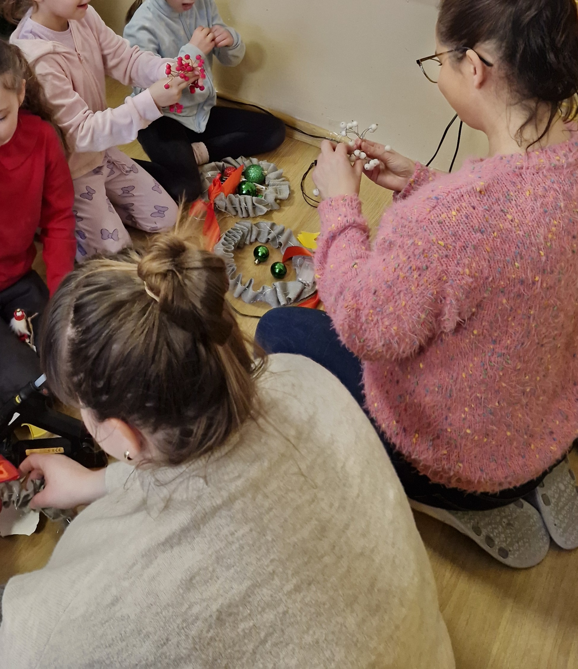 W dniu 15 grudnia w grupie „Biedroneczki” odbyły się zajęcia otwarte, które wprowadziły wszystkich w prawdziwie świąteczny klimat. Pod opieką pani Anny Kozak oraz przy wsparciu Rodziców, dzieci przygotowywały świąteczne wieńce ozdabiane bombkami, kokardkami i zimowymi motywami.