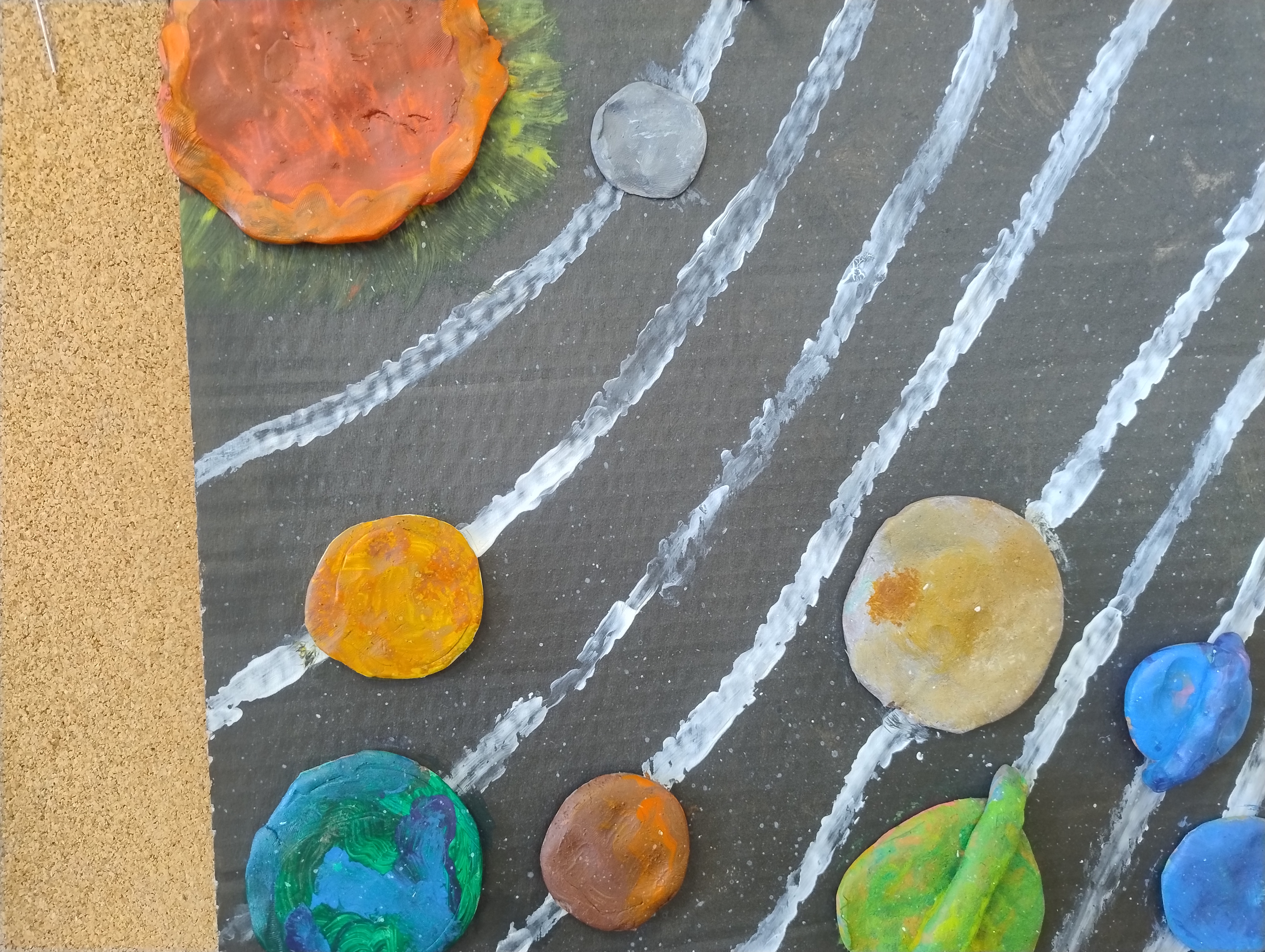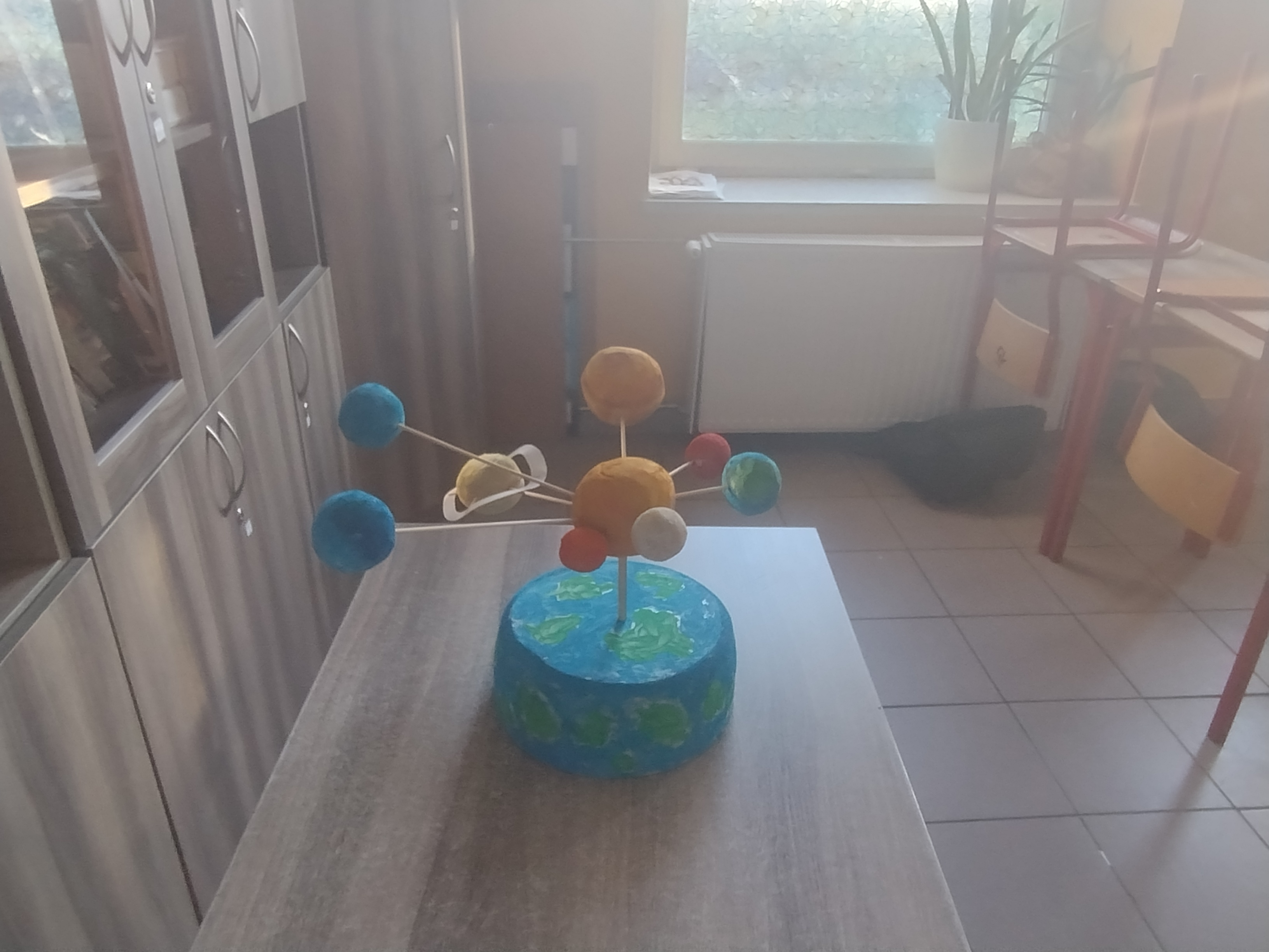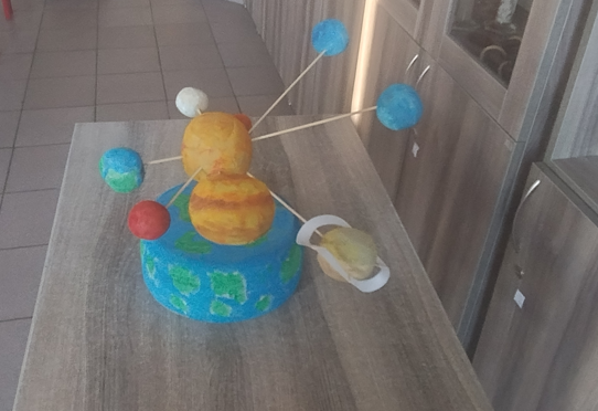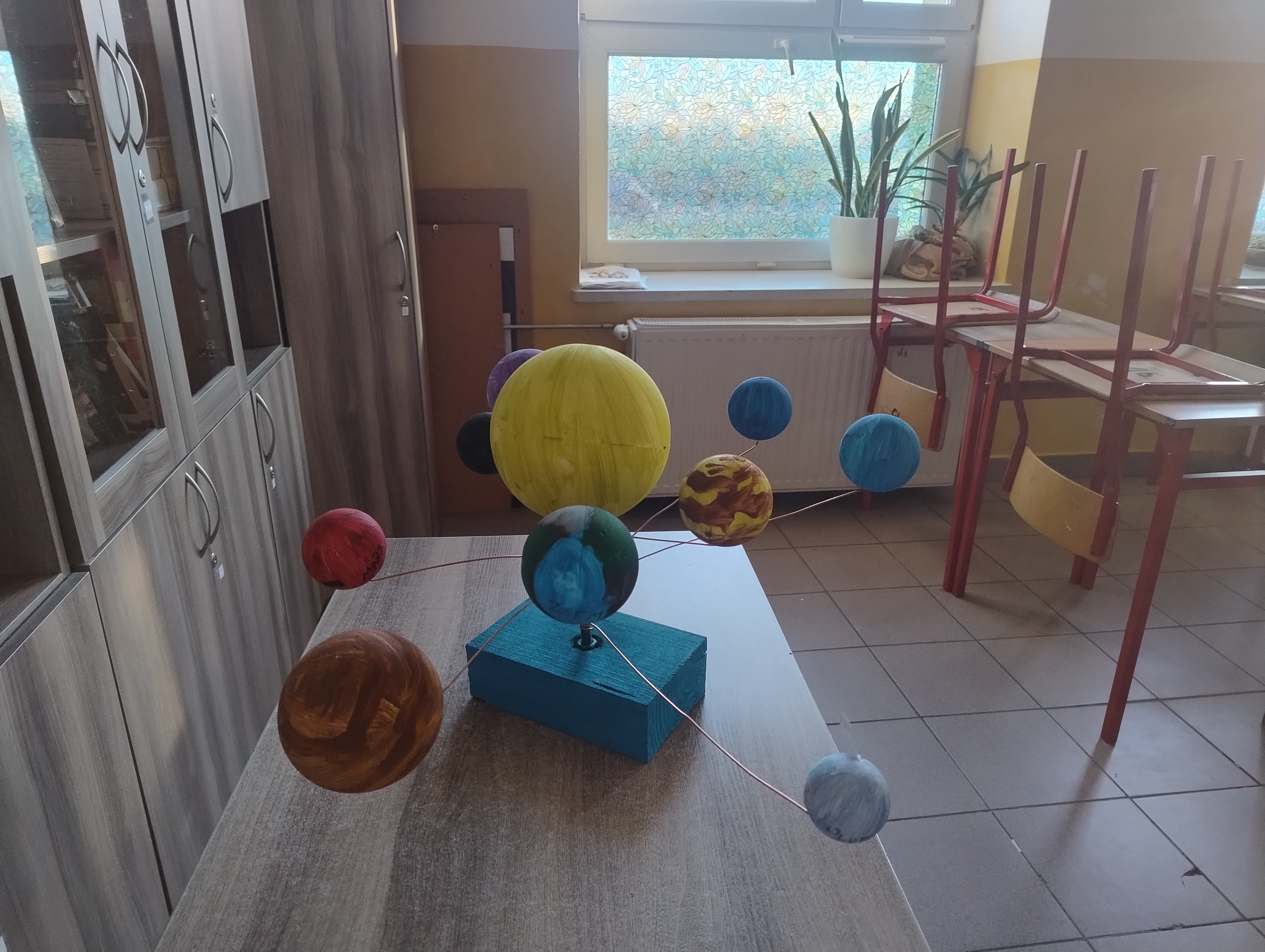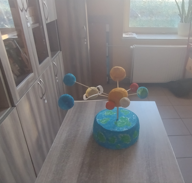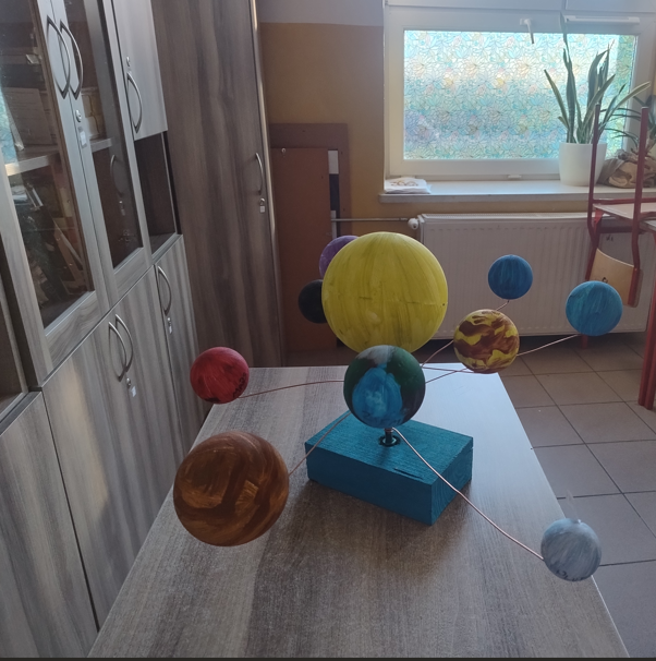 Na październikowych lekcjach geografii omawiając dział „Ruchy Ziemi” i temat „Ziemia w Układzie Słonecznym” chętni uczniowie klasy VI stworzyli projekty Układu Słonecznego.