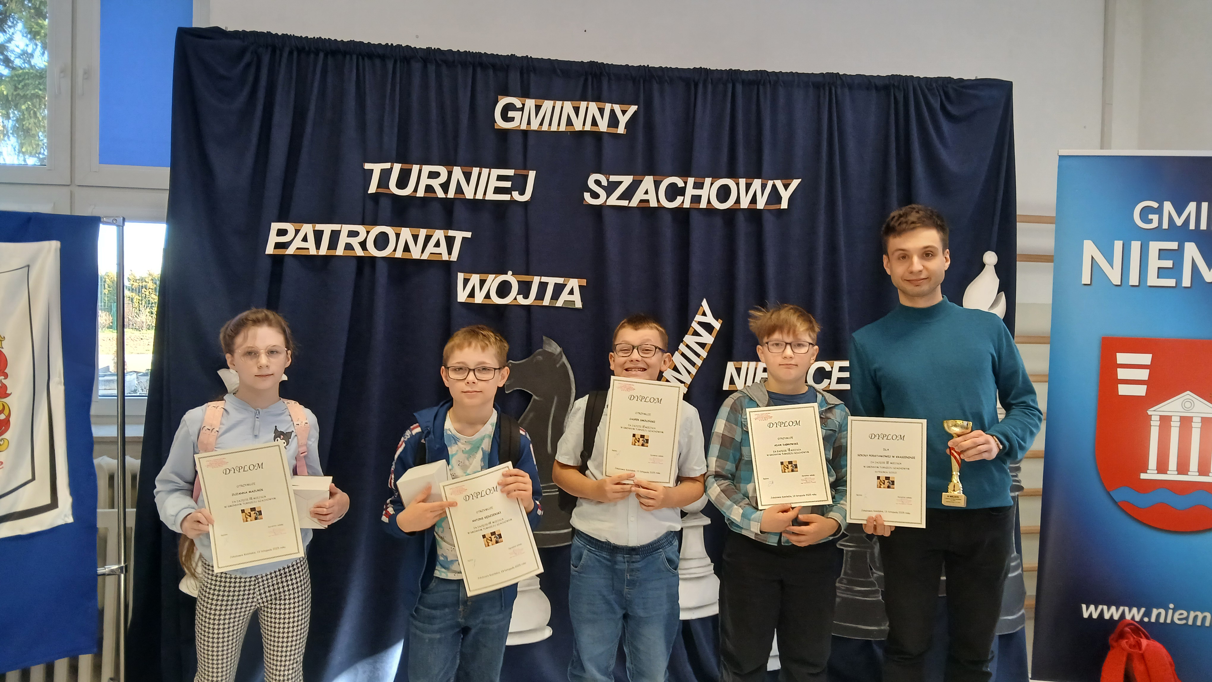 W dniu 13 listopada 2025 r. reprezentacja uczniów klasy 4 z naszej szkoły uczestniczyła w XIV Gminnym Turnieju Szachowym w kategorii klas I - VI. Przygotowana przez Pana Bogumiła Jakubowskiego drużyna zajęła III miejsce i była tylko o przysłowiowy włos za reprezentacją z SP w Jakubowicach Konińskich. Gratulujemy sukcesu i pięknej rywalizacji!