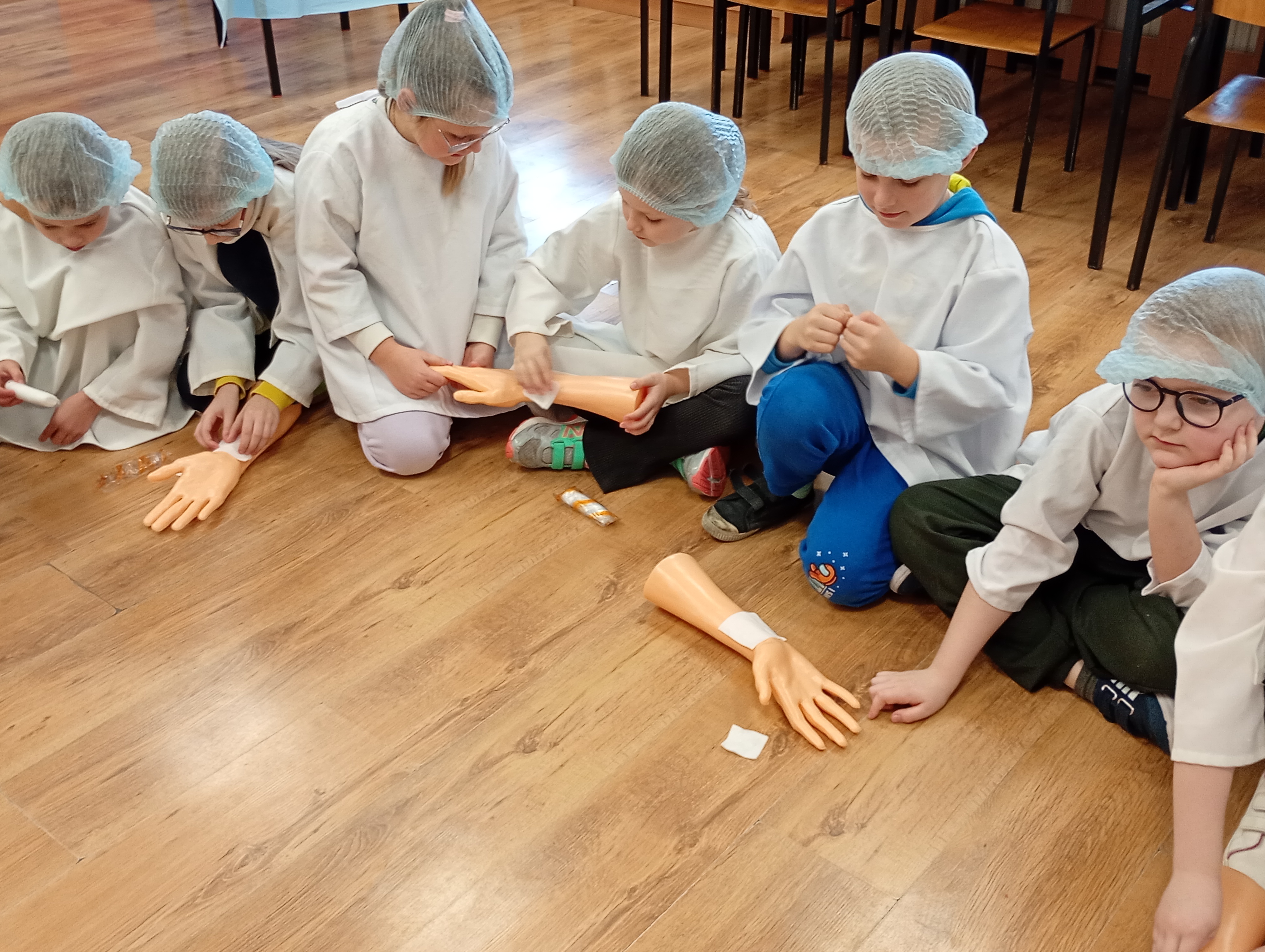Uczniowie z ogromnym zaangażowaniem uczestniczyli w części praktycznej – uczyli się udzielania pierwszej pomocy, a także prawidłowego zakładania opatrunków na rany.