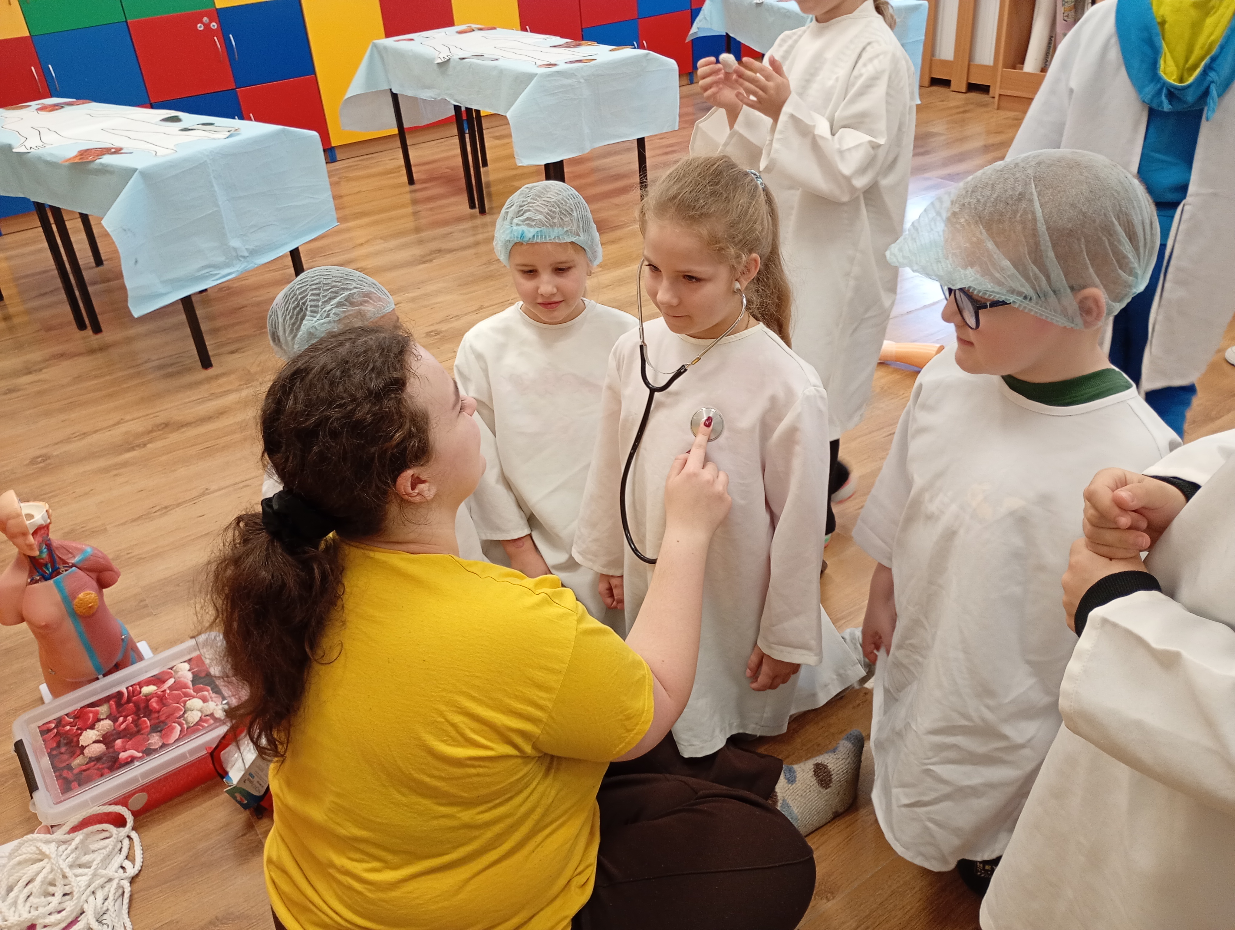 Dużą atrakcją było słuchanie bicia własnego serca oraz sprawdzanie, jak działa gips, którego zastosowanie wzbudziło sporo ciekawości i uśmiechu.