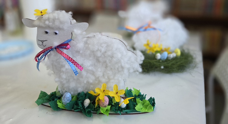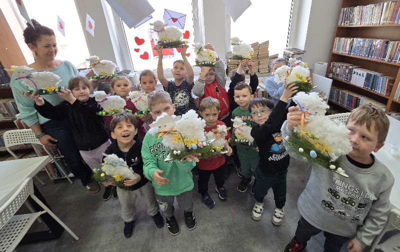 Następnie biblioteka zamieniła się w prawdziwą pracownię artystyczną! Pani Dorota opowiedziała nam o dawnych ozdobach wielkanocnych i zaprezentowała przykładowe prace . Podczas warsztatów wielkanocnych mali artyści wyczarowali puchate baranki z waty na trawce z kolorowej bibuły, wyklejonej pisankami oraz ozdobami z wykorzystaniem żółtych kwiatów forsycji ,biedronek i barwnych kokardek.